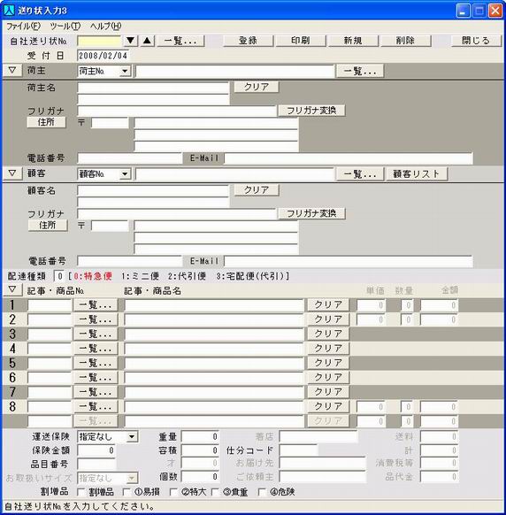 荷主、顧客、商品を登録することなく送り状を印刷することもできます。