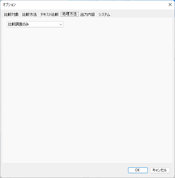 [比較対象] [比較方法] [テキスト比較] [処理方法] [出力内容] [システム] メイン画面の[同一ファイル検索]で使用します。 [比較調査のみ] 同一ファイルの比較調査を行います。 [コピー] 同一ファイルの調査後、同一ファイルを指定フォルダーにコピーします。 ※コピー先フォルダーに、同名ファイルが存在する場合は、ファイル名の後ろに"_(n)"が追加されます。nの部分は自動で連番が割り当てられます。 [すべてコピー] ・・・ 同一ファイルをすべてコピーします。 [サイズが大きいファイルをコピー] ・・・ 同一ファイルの中で、ファイルサイズが一番大きいファイルを1ファイルコピーします。サイズが同じときは同一ファイル内のいずれか1つのファイルがコピーされます。 [サイズが小さいファイルをコピー] ・・・ 同一ファイルの中で、ファイルサイズが一番小さいファイルを1ファイルコピーします。サイズが同じときは同一ファイル内のいずれか1つのファイルがコピーされます。 [最終更新日が新しいファイルをコピー] ・・・ 同一ファイルの中で、ファイルの最終更新日が一番新しいファイルを1ファイルコピーします。最終更新日が同じときは同一ファイル内のいずれか1つのファイルがコピーされます。 [最終更新日が古いファイルをコピー] ・・・ 同一ファイルの中で、ファイルの最終更新日が一番古いファイルを1ファイルコピーします。最終更新日が同じときは同一ファイル内のいずれか1つのファイルがコピーされます。 [作成日が新しいファイルをコピー] ・・・ 同一ファイルの中で、ファイルの作成日が一番新しいファイルを1ファイルコピーします。作成日が同じときは同一ファイル内のいずれか1つのファイルがコピーされます。 [作成日が古いファイルをコピー] ・・・ 同一ファイルの中で、ファイルの作成日が一番古いファイルを1ファイルコピーします。作成日が同じときは同一ファイル内のいずれか1つのファイルがコピーされます。 [移動] 同一ファイルの調査後、同一ファイルを指定フォルダーに移動します。 ※移動先フォルダーに、同名ファイルが存在する場合は、ファイル名の後ろに"_(n)"が追加されます。nの部分は自動で連番が割り当てられます。 [すべて移動] ・・・ 同一ファイルをすべて移動します。 [サイズが大きいファイルを移動] ・・・ 同一ファイルの中で、ファイルサイズが一番大きいファイルを1ファイル移動します。サイズが同じときは同一ファイル内のいずれか1つのファイルが移動されます。 [サイズが小さいファイルを移動] ・・・ 同一ファイルの中で、ファイルサイズが一番小さいファイルを1ファイル移動します。サイズが同じときは同一ファイル内のいずれか1つのファイルが移動されます。 [最終更新日が新しいファイルを移動] ・・・ 同一ファイルの中で、ファイルの最終更新日が一番新しいファイルを1ファイル移動します。最終更新日が同じときは同一ファイル内のいずれか1つのファイルが移動されます。 [最終更新日が古いファイルを移動] ・・・ 同一ファイルの中で、ファイルの最終更新日が一番古いファイルを1ファイル移動します。最終更新日が同じときは同一ファイル内のいずれか1つのファイルが移動されます。 [作成日が新しいファイルを移動] ・・・ 同一ファイルの中で、ファイルの作成日が一番新しいファイルを1ファイル移動します。作成日が同じときは同一ファイル内のいずれか1つのファイルが移動されます。 [作成日が古いファイルを移動] ・・・ 同一ファイルの中で、ファイルの作成日が一番古いファイルを1ファイル移動します。作成日が同じときは同一ファイル内のいずれか1つのファイルが移動されます。 [削除] 同一ファイルの調査後、同一ファイルを削除します。 [サイズが大きいファイルを削除] ・・・ 同一ファイルの中で、ファイルサイズが一番大きいファイルを1ファイル削除します。サイズが同じときは同一ファイル内のいずれか1つのファイルが削除されます。 [サイズが小さいファイルを削除] ・・・ 同一ファイルの中で、ファイルサイズが一番小さいファイルを1ファイル削除します。サイズが同じときは同一ファイル内のいずれか1つのファイルが削除されます。 [最終更新日が新しいファイルを削除] ・・・ 同一ファイルの中で、ファイルの最終更新日が一番新しいファイルを1ファイル削除します。最終更新日が同じときは同一ファイル内のいずれか1つのファイルが削除されます。 [最終更新日が古いファイルを削除] ・・・ 同一ファイルの中で、ファイルの最終更新日が一番古いファイルを1ファイル削除します。最終更新日が同じときは同一ファイル内のいずれか1つのファイルが削除されます。 [作成日が新しいファイルを削除] ・・・ 同一ファイルの中で、ファイルの作成日が一番新しいファイルを1ファイル削除します。作成日が同じときは同一ファイル内のいずれか1つのファイルが削除されます。 [作成日が古いファイルを削除
