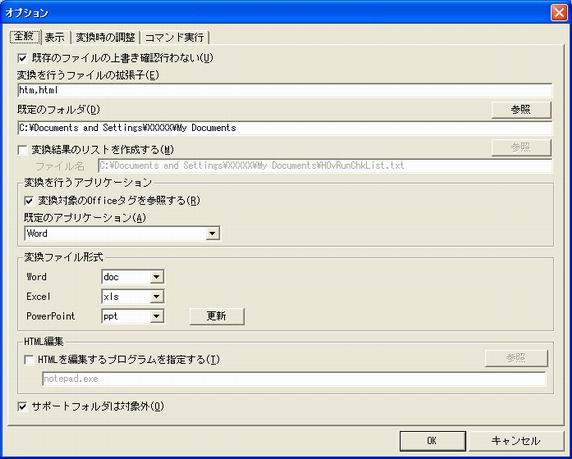 [変換結果のリストを作成する(R)] ONの場合 ・・・ 変換結果の情報を指定ファイルに書き込みます。 ※ファイル名に作成ファイルのフルパス名を入力します。 OFFの場合 ・・・ 変換結果の情報ファイルを作成しません。 [変換を行うアプリケーション] [変換対象のOfficeタグを参照する(R)] ONの場合 ・・・ 変換対象のHTMLファイルから、各Officeアプリケーションにより生成されたことを示す情報を取得し、その情報に基づき変換を行うアプリケーションを決定します。 OFFの場合 ・・・ すべて既定のアプリケーションを適用します。 [既定のアプリケーション(A)] 変換を行う既定のアプリケーションを選択します。 [変換ファイル形式] [Word] Wordに変換する場合のファイル形式を指定します。 ※Word2007を使用している場合のみdocxを指定できます。 [Excel] Excelに変換する場合のファイル形式を指定します。 ※Excel2007を使用している場合のみxlsxを指定できます。 [PowerPoint] PowerPointに変換する場合のファイル形式を指定します。 ※PowerPoint2007を使用している場合のみpptxを指定できます。 <更新> 現在のWord,Excel,PowerPointのバージョンを確認し、変換ファイル形式のリストを更新します。 [HTML編集] [HTMLを編集するプログラムを指定する(T)] ONの場合 ・・・ HTMLを編集する場合に起動するアプリケーションを指定します。 OFFの場合 ・・・ HTMLを編集する場合のnotepad.exeを起動します。 <参照> プログラムを選択する画面を開きます。 ※HTMLの編集プログラムを起動させる方法。 [メイン画面]のファイル表示領域で編集するHTMLのファイルを選択します。 マウスの右クリックによりメニューを表示します。 [HTMLを編集]を選択します。 [サポートフォルダは対象外(O)] ONの場合 ・・・ サポートフォルダのHTMLファイルは変換対象外にします。 ※サポートフォルダの場合は、個別に変換をする必要はありません。 サポートフォルダの判定は、変換対象のファイルと同盟ファイルのフォルダ、"<LINK REL=FILE-LIST HREF="で指定しているフォルダが対象になります。 例:C:\HTML\TEST.HTMの場合は、"C:\HTML\TEST"フォルダと"C:\HTML\TEST.FILES"フォルダ、C:\HTML\TEST.HTMで"<LINK REL=FILE-LIST HREF="指定しているフォルダが対象です。 OFFの場合 ・・・ サポートフォルダのHTMLも変換対象にします。