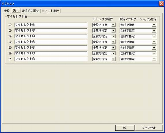 [マイセレクト名] [@] マイセレクト@の名前を入力します。 [A] マイセレクトAの名前を入力します。 [B] マイセレクトBの名前を入力します。 [C] マイセレクトCの名前を入力します。 [D] マイセレクトDの名前を入力します。 [E] マイセレクトEの名前を入力します。 [F] マイセレクトFの名前を入力します。 [Officeタグ確認] 各マイセレクトでOfficeタグの確認を指定します。 [全般で指定] ・・・ [全般]-[変換を行うアプリケーション]-[変換対象のOfficeタグを参照する(R)]で指定している内容で処理します。 [参照する] ・・・ Officeタグを参照します。 [参照しない] ・・・ Officeタグを参照しません。 [既定アプリケーションの指定] 各マイセレクトの既定アプリケーションを指定します。 [全般で指定] ・・・ [全般]-[既定のアプリケーション(A)]で指定している内容で処理します。 [Word] ・・・ Wordを指定します。 [Excel] ・・・ Excelを指定します。 [PowerPoint] ・・・ PowerPointを指定します。 テキスト [CSV] ・・・ テキスト[CSV]を指定します。