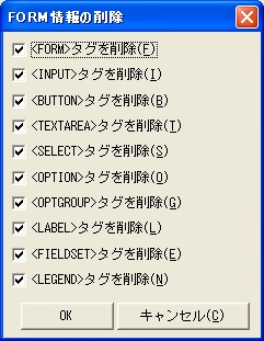<詳細> [FORM情報の削除]画面を開きます。 [<FORM>タグを削除(F)] ONの場合 ・・・ <FORM>タグを削除します。 OFFの場合 ・・・ <FORM>タグは削除しません。 [<INPUT>タグを削除(I)] ONの場合 ・・・ <INPUT>タグを削除します。 OFFの場合 ・・・ <INPUT>タグは削除しません。 [<BUTTON>タグを削除(B)] ONの場合 ・・・ <BUTTON>タグを削除します。 OFFの場合 ・・・ <BUTTON>タグは削除しません。 [<TEXTAREA>タグを削除(T)] ONの場合 ・・・ <TEXTAREA>タグを削除します。 OFFの場合 ・・・ <TEXTAREA>タグは削除しません。 [<SELECT>タグを削除(S)] ONの場合 ・・・ <SELECT>タグを削除します。 OFFの場合 ・・・ <SELECT>タグは削除しません。 [<OPTION>タグを削除(O)] ONの場合 ・・・ <OPTION>タグを削除します。 OFFの場合 ・・・ <OPTION>タグは削除しません。 [<OPTGROUP>タグを削除(G)] ONの場合 ・・・ <OPTGROUP>タグを削除します。 OFFの場合 ・・・ <OPTGROUP>タグは削除しません。 [<LABEL>タグを削除(L)] ONの場合 ・・・ <LABEL>タグを削除します。 OFFの場合 ・・・ <LABEL>タグは削除しません。 [<FIELDSET>タグを削除(E)] ONの場合 ・・・ <FIELDSET>タグを削除します。 OFFの場合 ・・・ <FIELDSET>タグは削除しません。 [<LEGEND>タグを削除(N)] ONの場合 ・・・ <LEGEND>タグを削除します。 OFFの場合 ・・・ <LEGEND>タグは削除しません。