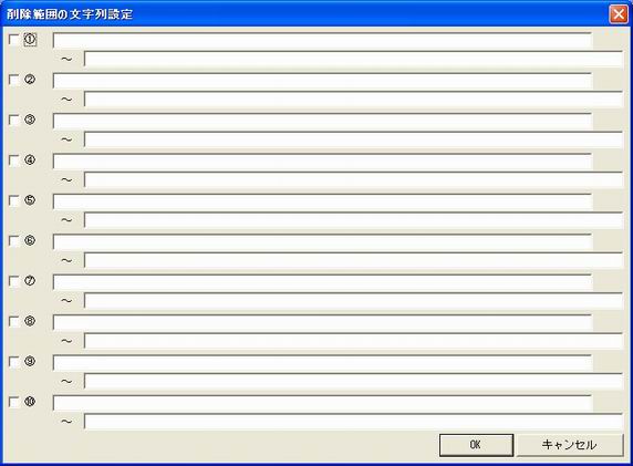 削除範囲の開始文字列と終了文字列を入力します。 チェックを付けると、該当削除範囲になります。 例:開始文字列"<!-- ヘッダ -->"、終了文字列"<!-- ヘッダーエンド -->"を入力した場合 <!-- ヘッダー>〜<!-- ヘッダーエンド -->は、変換前に削除します。