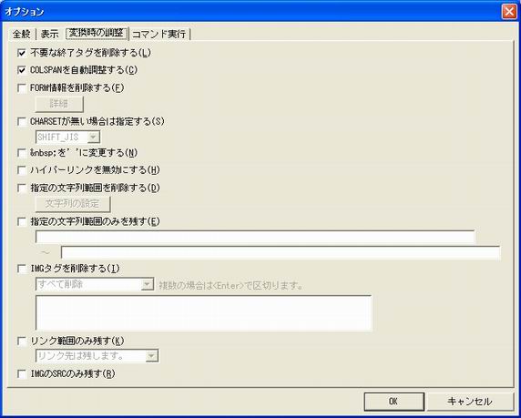 [FORM情報を削除する(F)] ONの場合 ・・・ 変換前にFORM情報を削除します。 (元のHTMLファイルは変更しません。) <詳細> [FORM情報の削除]画面を開きます。 [<FORM>タグを削除(F)] ONの場合 ・・・ <FORM>タグを削除します。 OFFの場合 ・・・ <FORM>タグは削除しません。 [<INPUT>タグを削除(I)] ONの場合 ・・・ <INPUT>タグを削除します。 OFFの場合 ・・・ <INPUT>タグは削除しません。 [<BUTTON>タグを削除(B)] ONの場合 ・・・ <BUTTON>タグを削除します。 OFFの場合 ・・・ <BUTTON>タグは削除しません。 [<TEXTAREA>タグを削除(T)] ONの場合 ・・・ <TEXTAREA>タグを削除します。 OFFの場合 ・・・ <TEXTAREA>タグは削除しません。 [<SELECT>タグを削除(S)] ONの場合 ・・・ <SELECT>タグを削除します。 OFFの場合 ・・・ <SELECT>タグは削除しません。 [<OPTION>タグを削除(O)] ONの場合 ・・・ <OPTION>タグを削除します。 OFFの場合 ・・・ <OPTION>タグは削除しません。 [<OPTGROUP>タグを削除(G)] ONの場合 ・・・ <OPTGROUP>タグを削除します。 OFFの場合 ・・・ <OPTGROUP>タグは削除しません。 [<LABEL>タグを削除(L)] ONの場合 ・・・ <LABEL>タグを削除します。 OFFの場合 ・・・ <LABEL>タグは削除しません。 [<FIELDSET>タグを削除(E)] ONの場合 ・・・ <FIELDSET>タグを削除します。 OFFの場合 ・・・ <FIELDSET>タグは削除しません。 [<LEGEND>タグを削除(N)] ONの場合 ・・・ <LEGEND>タグを削除します。 OFFの場合 ・・・ <LEGEND>タグは削除しません。 OFFの場合 ・・・ FORM情報の削除を行いません。 [CHARSETが無い場合は指定する(S)] ONの場合 ・・・ CHARSETが指定されていない場合は、「SHIFT_JIS、JIS、EUC-JP、UTF-8」の中から指定したキャラクタでCHARSETを行います。 ※文字化けが発生する場合に、改善される場合があります。 OFFの場合 ・・・ CHARSETの確認を行いません。
