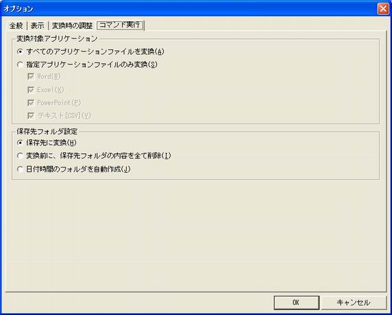 [変換対象アプリケーション] [すべてのアプリケーションファイルを変換(A)] Word、Excel、PowerPoint、テキスト[Csv]の変換ファイルが対象になります。 [指定アプリケーションのファイルのみ変換] [Word(W)] ONの場合 ・・・ Wordのファイル(doc,docx)への変換は対象です。 OFFの場合 ・・・ Wordのファイル(doc,docx)への変換は対象外です。 [Excel(X)] ONの場合 ・・・ Excelのファイル(xls,xlsx)への変換は対象です。 OFFの場合 ・・・ Excelのファイル(xls,xlsx)への変換は対象外です。 [PowerPoint(P)] ONの場合 ・・・ PowerPointのファイル(ppt,pptx)への変換は対象です。 OFFの場合 ・・・ PowerPointのファイル(ppt,pptx)への変換は対象外です。 [テキスト[CSV](V)] ONの場合 ・・・ CSV形式ファイルの変換は対象です。 OFFの場合 ・・・ CSV形式ファイルの変換は対象外です。 [保存先フォルダ設定] [保存先に変換(H)] 保存先のフォルダまたはファイルと同一フォルダに変換します。 [変換前に、保存先フォルダの内容を全て削除(I)] 変換前に保存先のフォルダ内容を全て削除した後に変換します。 ※フォルダ単位の変換、設定ファイルの変換で有効になります。 [日付時間のフォルダを自動作成(J)] 保存先フォルダの階層下に日付時間("YYYYMMDDHHNNSS"形式)のフォルダを作成し、作成したフォルダに変換します。