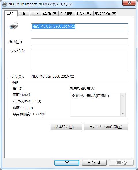 用紙サイズを設定します。 再度、[画面1]のプリンターのプロパティを開きます。 <基本設定(E)...>をクリックし、印刷設定画面を開きます。