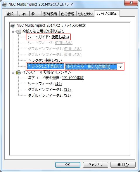 給紙方法と用紙の割り当てで、1.のプリントサーバーのプロパティで入力した用紙を選択し<OK>で確定します。(例:ゆうパック 元払A(店舗用)) 連続用紙を給紙する場所を1か所のみ指定し、他はすべて「使用しない」にします。