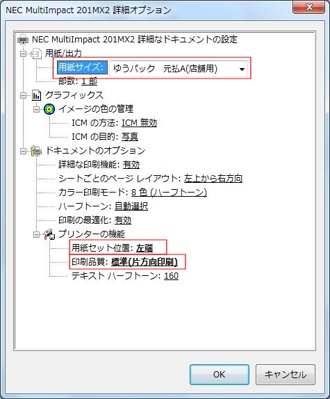 [プリンターの機能]-[用紙セット位置]を[左端]にします。 [プリンターの機能]-[印刷品質]は「標準(片方向印刷)または高速(片方向印刷)」を選択します。 <OK>で確定します。