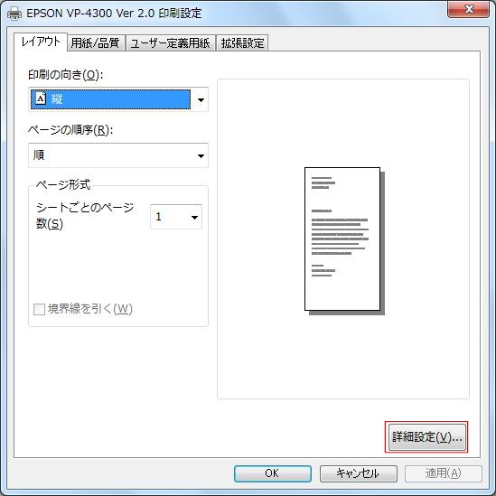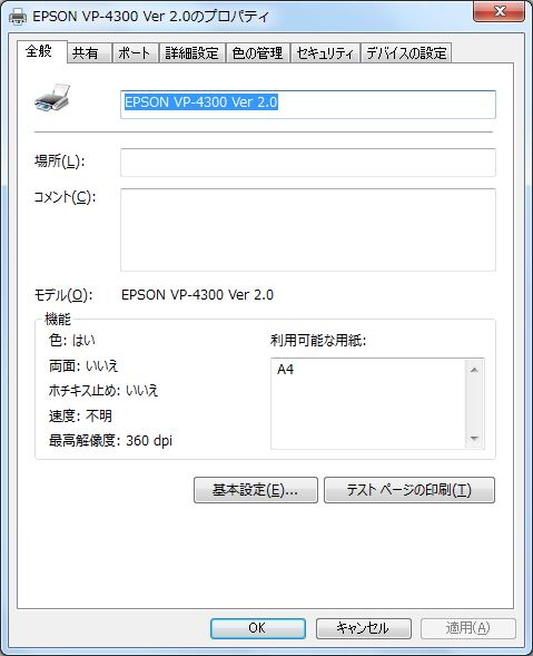 設定するプリンターのプロパティを開きます。(例:EPSON VP-4300 Ver 2.0)[画面1]