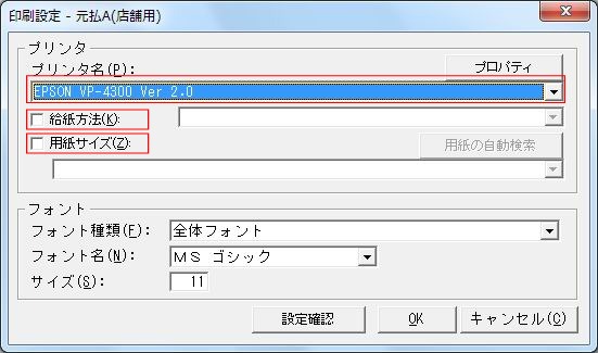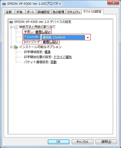 プリンターの設定 ※プリンターは「ゆうパック 元払A(店舗用)」専用として設定します。 他のプログラムで同じプリンターを使用して印刷する場合は、同じプリンターを名前を変えて「 ゆうパック 元払A(店舗用)」専用でインストールします。 設定するプリンターのプロパティを開きます。(例:EPSON VP-4300 Ver 2.0)[画面1] 「デバイスの設定」タブを選択します。[元払A(店舗用)の場合] 給紙方法と用紙の割り当てで、 幅9インチ以上、高さ4インチの用紙を選択し<OK>で確定します。(例:連続用紙 15x4inch) [コレクトサービスラベルの場合] 給紙方法と用紙の割り当てで、 幅10.2インチ以上、高さ4.5インチの用紙を選択し<OK>で確定します。(例:連続用紙 15x4 1/2inch)) ※連続用紙を給紙する場所を1か所のみ指定し、他はすべて「使用しない」にします。 用紙サイズを設定します。再度、[画面1]のプリンターのプロパティを開きます。<基本設定(E)...>をクリックし、印刷設定画面を開きます。 <詳細設定(V)...>をクリックし、詳細オプションを開きます。 [元払A(店舗用)の場合] [コレクトサービスラベルの場合] [用紙/出力]の用紙サイズにU.で指定した用紙を設定します。 <OK>で確定します。 [簡易送り状印刷YP5]プログラムの設定 [簡易送り状印刷YP5]プログラムを起動します。 メニュー-[ツール(T)]-[プリンタ設定(P)]-[元払A(店舗用)(T)]で[印刷設定-元払A(店舗用)]を開きます。 ※メニュー-[ツール(T)]-[プリンタ設定(P)]の各種送り状名[元払A(店舗用)(T)]等で送り状種類に対しての設定を切り替えます。 [プリンタ名(P)]に、[2. プリンタドライバの設定]で設定したプリンタを選択します。 [給紙方法(K)]のチェックを外します。 [用紙サイズ(Z)]のチェックを外します。 <登録>で、設定内容を登録します。