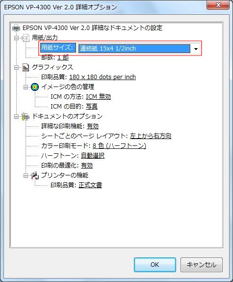 給紙方法と用紙の割り当てで、 幅10.2インチ以上、高さ4.5インチの用紙を選択し<OK>で確定します。(例:連続用紙 15x4 1/2inch))