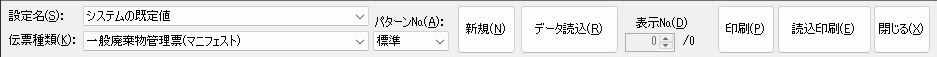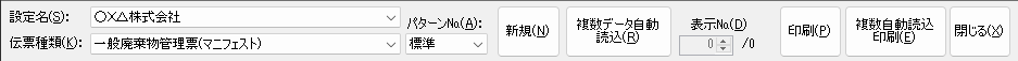 ※一度に読み込めるファイル数は1ファイルです。[複数読込印刷(E)] ・・・ 複数のデータファイルからデータを読み込み、印刷します。 *1 [複数自動読込印刷(E)] ・・・ 設定内容を元に読込ファイルを自動選択し、データを読み込み、印刷します。 *1 [終了(X)] ・・・ プログラムを終了します。 *1は[設定名]で選択している設定内容によって表示される内容が変わります。