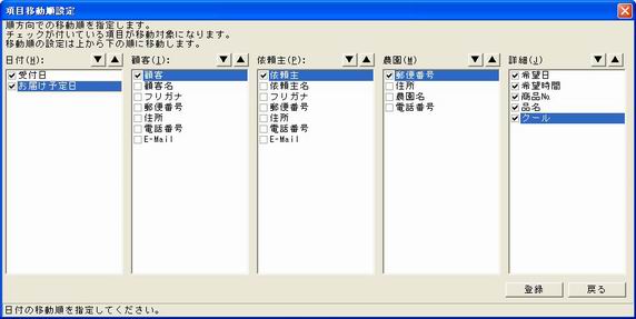 [送り状入力]で項目を移動する順番を設定します。 [日付(H)] 日付部分の移動順番を指定します。 [顧客(I)] 顧客部分の移動順番を指定します。 [依頼主(P)] 依頼主部分の移動順番を指定します。 [農園(M)] 農園部分の移動順番を指定します。 [詳細(J)] 詳細部分の移動順番を指定します。 <▼>、<▲> 選択項目の移動順番を変更します。 <登録> 設定内容を登録します。 <戻る> 入力内容を保存せずに、前の画面に戻ります。