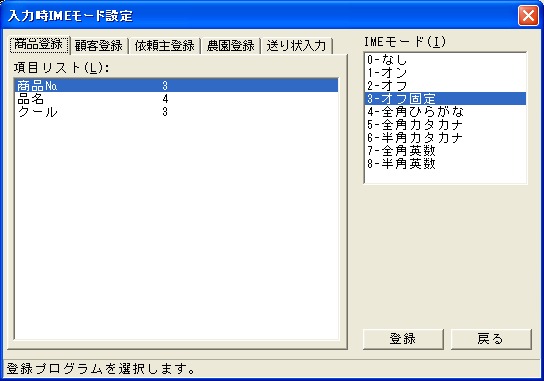 [農園登録]での入力時に使用するIMEのモード設定を行います。