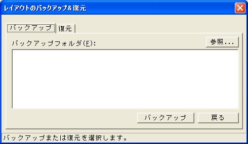 [バックアップフォルダ(F)] レイアウト用データのバックアップフォルダを指定します。 <参照> フォルダ参照画面を開きます。 <バックアップ> レイアウトデータをバックアップします。 <戻る> 前の画面に戻ります。