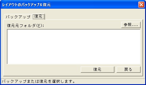 [復元元フォルダ(F)] 復元もとのフォルダを指定します。(以前レイアウトのバックアップで指定したフォルダを指定してください。) <参照> フォルダ参照画面を開きます。 <復元> レイアウト用データのバックアップデータを復元します。 <戻る> 前の画面に戻ります。