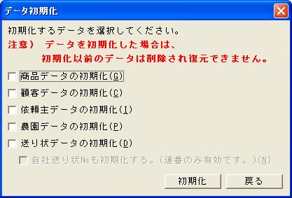 データの初期化を行います。 [商品データの初期化(G)] 商品台帳を初期化する場合は、チェックを付けます。 [顧客データの初期化(C)] 顧客台帳を初期化する場合は、チェックを付けます。 [依頼主データの初期化(I)] 依頼主台帳を初期化する場合は、チェックを付けます。 [農園データの初期化(P)] 農園台帳を初期化する場合は、チェックを付けます。 [送り状データの初期化(D)] 送り状データを初期化する場合は、チェックを付けます。 [自社送り状b熄炎化する。(連番のみ有効です。(N)] 送り状データを初期化するときに、自社送り状b連番で指定している 場合は、チェックを付けることで送り状番号は1番から始まります。※年月+連番を使用している場合は、この項目は無視されます。 番号は年月+0001番から始まります。 <初期化> 指定データを初期化します。 <戻る> 前の画面に戻ります。