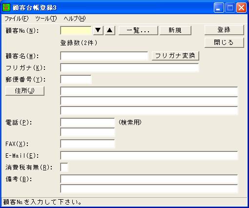 [スタート]-[プログラム]-[農園用送り状印刷KY4]-[メニュー]で[メニュー]を起動します。 [07.顧 客台帳登録]で[顧客台帳登録3]を起動します。 [顧客(N)]を入力します。 新規顧客を登録する場合: 登録したい番号(登録していない番号)を入力して<Enter>キーを押します。(文字列番号なので、01と001は別の顧客として扱われます。) 以前登録した顧客を変更する場合: 変更したい顧客の顧客b入力して<Enter>キーを押して変更する顧客を呼び出します。※顧客bェわからない場合。 <一覧>ボタンを押して[顧客一覧]を開きます。 検索種類を選択します。「顧客av、「顧客名」、「電話番号」、「E-Mail」、「フリガナ」の中から選択します。 検索をする文字列を入力して<検索>ボタンを押します。検索最大件数は100件です。見つからない場合は検索文字列を変更するか、別の種類で検索を行います。 表示するデータを選択しマウスのダブルクリックまたは<Enter>キーで確定します。 ※表示している顧客の前後(顧客)を呼び出すときは、<▼>ボタンまたは<▲>ボタンを押します。 [顧客名(M)]を入力します。 送り状入力時に[顧客名]に表示されます。 [フリガナ(K)]を入力します。 送り状入力時に[フリガナ]に表示されます。 [郵便番号(Y)]を入力します。 送り状入力時に[郵便番号]に表示されます。 [住所(J)]を入力します。 送り状入力時に<住所>に表示されます。 [電話(P)]を入力します。 送り状入力時に上段データ(検索用)が[電話番号]に表示されます。 [FAX(X)]を入力します。 情報用項目です。 [E-Mail(E)]を入力します。 送り状入力時に[E-Mail]に表示されます。 [消費税有無(R)]を入力します。 情報用項目です。 [備考(B)]を入力します。 情報用項目です。 <登録>ボタンを押して入力顧客の登録を行います。 <閉じる>ボタンを押してプログラムを終了します。