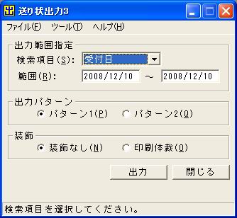 [スタート]-[プログラム]-[農園用送り状印刷KY4]-[メニュー]で[メニュー]を起動します。 [04.送り状出力]で[送り状出力3]を起動します。 [検索項目(S)]を指定します。 [範囲(R)]に検索する範囲を入力します。 [出力パターン]を指定します。 [装飾]を指定します。 <出力>ボタンを押して、送り状をExcelに出力します。 <閉じる>ボタンを押してプログラムを終了します。