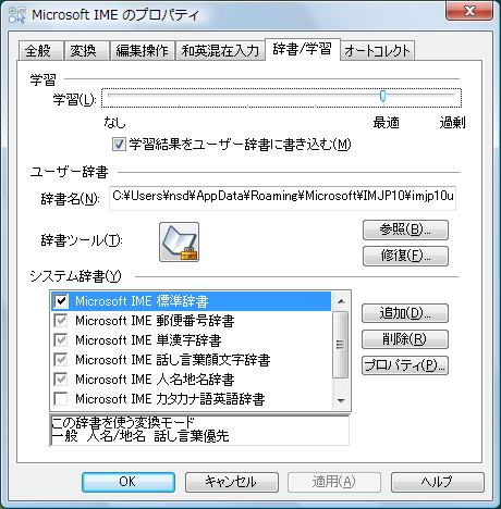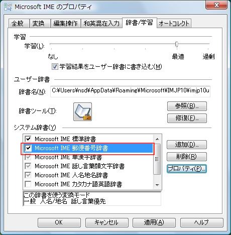 IMEのプロパティを表示します。 [ツール]-[プロパティ(R)]でプロパティ画面を開きます。 [辞書/学習]タブをクリックします。 [システム辞書(Y)]のリストから[Microsoft IME 郵便番号辞書]を選択します。 [Microsoft IME 郵便番号辞書]のチェックを一度外し、再度チェックし濃いチェックマーク(一般 人名/地名 話し言葉優先)にします。 <OK>をクリックします。